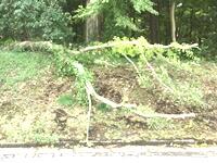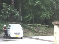 台風の影響からの安全確保の観点から、登校禁止とした8月9日(木)、本校正門外側道路の対面の林の長さ12m・直径20㎝の木が倒れ、道路を半分ふさいでいました。朝早く出勤された公仕さん達が発見して、すぐに枝を切り落とし、幹を安全な場所に運んで、解体してくださいました。下の写真は枝を切り落とした後の幹です。