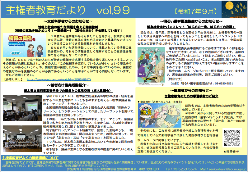すでに、とちぎテレビ「県議会ハイライト」や、RADIO BERRY FM栃木「Flying Friday」において放送されていましたが、今回は国の総務省から発行された「主権者教育だより」にも掲載されましたので、そのお知らせになります。また、栃木県教育委員会のHPにも紹介されています。