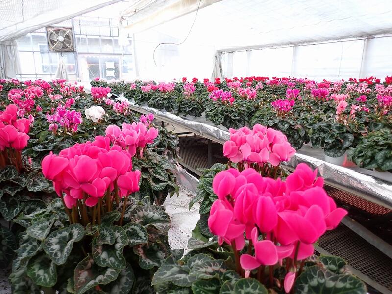 販売物 シクラメン(6号鉢2000円 5号鉢1500円)パンジー・ビオラ苗(60円)土つきネギ(1袋500円)キャベツ(1玉100円)