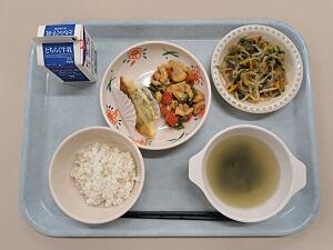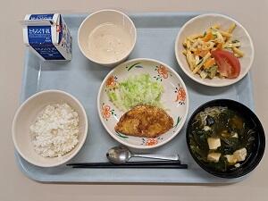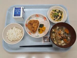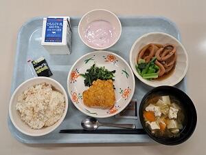 【感想】カレイの唐揚げは衣がサクサクのうえ、カレー風味でご飯がすすみました。千種焼きは、野菜がたっぷり入っていて、甘くておいしかったです。えだ豆がたくさん入ったポテトサラダ、ふた肉たっぷりの大根汁もあり、今日から始まる学年考査頑張れそうです。