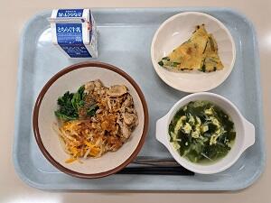 【感想】親子丼は鶏肉、卵のほかにしめじやほうれん草が入っていておいしかったです。みそ汁は大きくカットされた里芋、人参、ゴボウなど具だくさんでお腹いっぱいになりました。卒業生はあと3回しか給食が食べられないので、かみしめてたべましょう!!