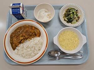 【感想】今年度最初の給食は、みんな大好きポークカレー!辛さの中に甘みもあり、とてもおいしかったです。デザートのヨーグルトもうれしかったです。調理員の皆さん1年間よろしくお願いします。