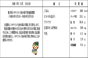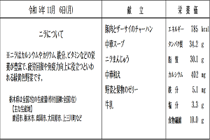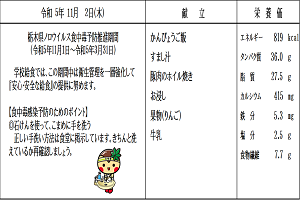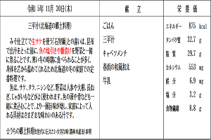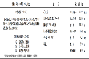 【感想】今日から全国学校給食週間です。日本で最初の給食と言われている「おにぎり」「焼き魚」「漬物」を食べ、明治の頃の子どもたちと同じ体験ができました。今日はプラス、あたたかい豚汁、ほうれん草の甘みある油炒め、冷たいゼリーもあり大満足でした。