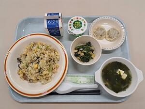 【感想】)チャーハンは、炒り卵が少な目に感じましたが(学栄:卵は1人Mサイズ1個分使用しています)豚肉、ピーマン、なるとなどが入っていて、あっという間に食べ終わりました。カムジャポックムはじゃがいもと玉ねぎ、サラダもきゅうり、人参、レタスのシャキシャキした歯ごたえがおいしかったです。