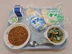 【感想:M先生】ドライカレーは、ひきわり大豆、ぶたひき肉、みじん切りの野菜がたっぷり入ったカレーの具と、ターメリックで黄色く着色されたごはんは、見たものよくおいしかったです。スープもサラダも野菜たっぷり、ビタミンカラーで元気になりました。