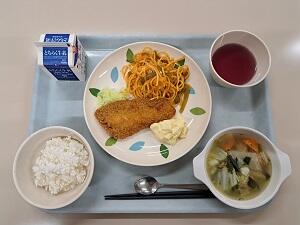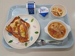 【感想】今日は、南欧風の給食でした。トーストにはピザソース、その上にピーマン玉ねぎ、ハムとチーズがのっていいてとてもおいしかったです。ポトフにはたっぷりの春キャベツにウズラの卵、大豆、その他野菜も入っていてしっかり火が通っていて柔らかく食べやすかったです。冷たいスパゲッティサラダで口直し、さっぱりしました。