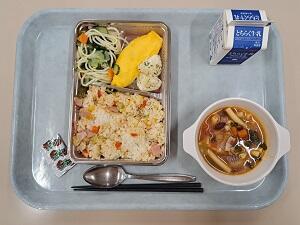 【感想】今日は、南ヨーロッパを感じる給食でした。トーストの上にのったチーズが伸びてピザようでした。スープは熱々で、ブロッコリー、人参、じゃがいもなどの野菜たっぷりで、あさりやベーコンも入っていておいしかったです。オムレツもじゃがいもたっぷりで甘くておいしかったです。