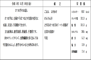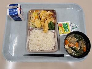 【感想】南蛮漬けの白身魚フライは衣がサクサクで、甘酢漬けされた玉ネギ、人参、ピーマンのスライスがかっていてとてもおいしかったです。薩摩汁は里芋、大根、ゴボウ、人参、鶏肉など具沢山で食べ応えがありました。甘い玉子焼きにふかし芋もあり、テスト最終日も頑張れそうです。