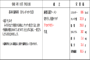 【感想】今日は中華づくしのメニューでした。麻婆豆腐はほんのりピリ辛で、ごはんが進みました。麻婆丼にしてもいいですね。かきたま汁はふわふわ卵たっぷりでおいしかったです。卒業生は残り2回になります。味わって食べましょう。