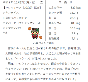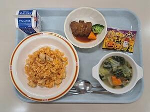 【感想】今日は、一足早い『ハロウィン給食!!』かぼちゃ(こうもりの意見もあり)の形のハンバーグ、ケチャップ風味のチキンライス、パンプキンのパフと雰囲気抜群でした。チキンライスは鶏肉、みじん切りの玉ねぎ、ピーマン、マッシュルームがたっぷり入っていてパクッと食べてしまいました。白菜とベーコンたっぷりのポトフは具が柔らかく味がしみておいしかったです。ごちそうさまでした