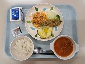 【感想】今日は気温が下がり肌寒いくらいだったので、ミネストローネスープで心も体もポカポカになりました。サーモンフライは、衣サクサクで身はやわらかく、イタリアンソテーはベーコン、玉ネギたっぷりでおいしかったです。じゃがバターはバターがほど良くしみ込んで、こちらもおいしかったです。ごちそうさまでした。