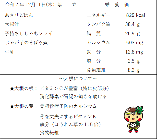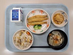 【感想:S先生】あさりごはんは、あさりの嚙みごたえがあり、あさりの出汁(うま味)が良く出て味も美味しい。じゃが芋のそぼろ煮は柔らくて食べやすく、子持ちししゃもフライは揚げたてでサクッとした食感が心地好い。大根汁は、大根が柔らかく、豚肉の甘味が汁に溶け込み温かくて美味しい。ごちそうさまでした。