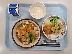 【感想】昨日が節分ということで、今日は節分メニューの給食でした。きつねうどんは、油揚げの他に、ワカメ、人参、ネギがたっぷり入って、一段と冷え込んでいる日にはちょうど良い熱さでおいしかったです。いわしのみそ煮、野菜のかき揚げ、豆腐のあんかけと、おがずの種類も豊富でうれしかったです。1日遅れですが、福豆を食べ、今年1年の無病息災を祈りたいと思います。ごちそうさまでした。