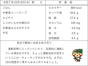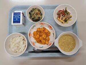 【感想】今日は、中華風の給食!! エビチリはプリプリのエビに甘辛チリソースがマッチしてごはんがすすみました。コーンスープは熱々で、とき卵とコーンがたくさんでおいしかったです。中華炒めはポテト、ピーマン、牛肉が柔らかく、春雨サラダはワカメやもやし、ハム、ほうれん草がなどたっぷり入っていて冷たくておいしかったです。ごちそうさまでした。