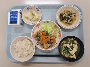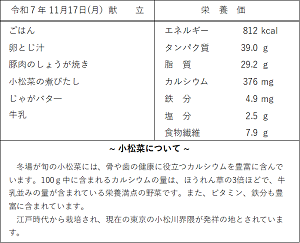 令和7年11月17日(月) 投稿日時 : 18:30 管理者 【感想】しょうが焼きは、豚肉、ピーマン、人参など色とりどりで、肉も野菜も柔らかく、甘めの味つけでごはんが進みました。卵とじ汁は、とき卵がフワフワして面白い食感でした。じゃがバターは、じゃが芋にバターがしっかりしみ込んでいておいしかったです。ごちそうさまでした。