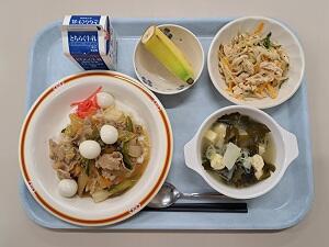 【感想:U先生】朝夕と肌寒くなってくると、温かい給食は何よりのごちそうですね。たんぱく質や野菜も豊富にとれる栄養バランスも良い献立でした。ごちそうさまでした。