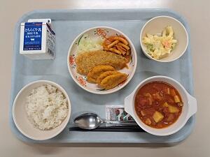 【感想】クラムチャウダーは熱々で、身体が温まりました。アサリ、さつまいも、人参が入り、トマトたっぷりのスープとマッチしておいさかったです。魚のフライは衣カリカリで中身フワフワ、チキンナゲットはトマトケチャップを付けると、よりおいしく食べられました。マカロニソテー、サラダもおいしかったです。ごちそうさまでした。