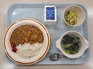 【感想】今日は、高校生の大好物の一つのカレーライス!! 中辛に近い甘口で、豚肉、じゃがいも、人参、玉ネギなど具だくさんで、あっという間に食べてしまいました。コンソメスープ、コーンサラダもおいしかったです。球技大会後半も頑張れそうです。ごちそうさまでした。