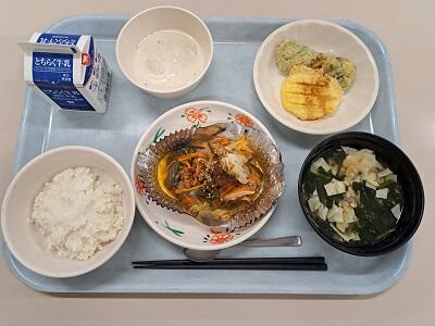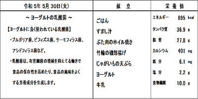 令和5年5月30日(火) 投稿日時 : 2023/05/30 管理者 【感想】ホイル焼きは、タレ(※みそ、上白糖、酒、みりん、ごま、バター)の味がしっかりしみ込んだ豚肉に蒸し焼きされたことで苦味を感じさせないピーマン、甘みが引き出された玉ねぎに人参、とてもおいしく食べやすかったです。じゃがいもの天ぷら、竹輪の磯部揚げは大きく食べ応えがありました。デザートのバナナ入りヨーグルトはさっぱりとしておいしかったです。ごちそうさまでした。