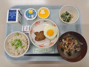 【感想】十五夜には少し早いですが、ウサギの形のハンバーグに目玉焼き、かわいいうさぎのゼリーと、秋の名月を感じるさせる給食でした。さと芋ごはんには枝豆ものって、昨日のさつま芋ごはんとは違ったおいしさでした。塩味の豚汁には、豚肉、豆腐、にんじん、ねぎ、かわいくカットされた白こんにゃくと具だくさんでお腹いっぱいになりました。ごちそうさまでした。