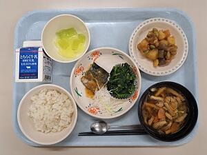【感想】今日は寒かったので、熱々のきつねうどんは心も身体も温まりました。サバのみそ煮は、厚めの切り身に甘みそとシャキシャキの白髪ねぎがマッチしておいしかったです。大豆の甘辛煮は、大豆の他に角切りのこんにゃくにじゃがいもや人参、枝豆も入っていて色々な食感を楽しめました。デザートのマスカットとレモンのミックスゼリーもおいしかったです。ごちそうさまでした。