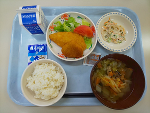 令和7年9月30日(火) 投稿日時 : 19:00 管理者 【感想】秋を感じさせるさつま芋ごはんは、さつま芋がホクホクして甘く、おいしかったです。白身魚フライは衣がカリッとして身がやわらかく南蛮漬けとマッチしていました。魚介ナゲットは焼売のような食感でジューシーでおいしかったです。ごちそうさまでした