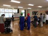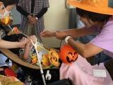 10月はハロウィンパーティとして校内ウォークラリーをしました。仮装した児童生徒が校長室、事務室、保健室、中高等部棟を回り、「トリック・オア・トリート」の言葉を録音した機器のスイッチを押して、お菓子やシールをもらいました。その後は、スクリーンに映した海や花火、パレードなどの映像を見て過ごしました。