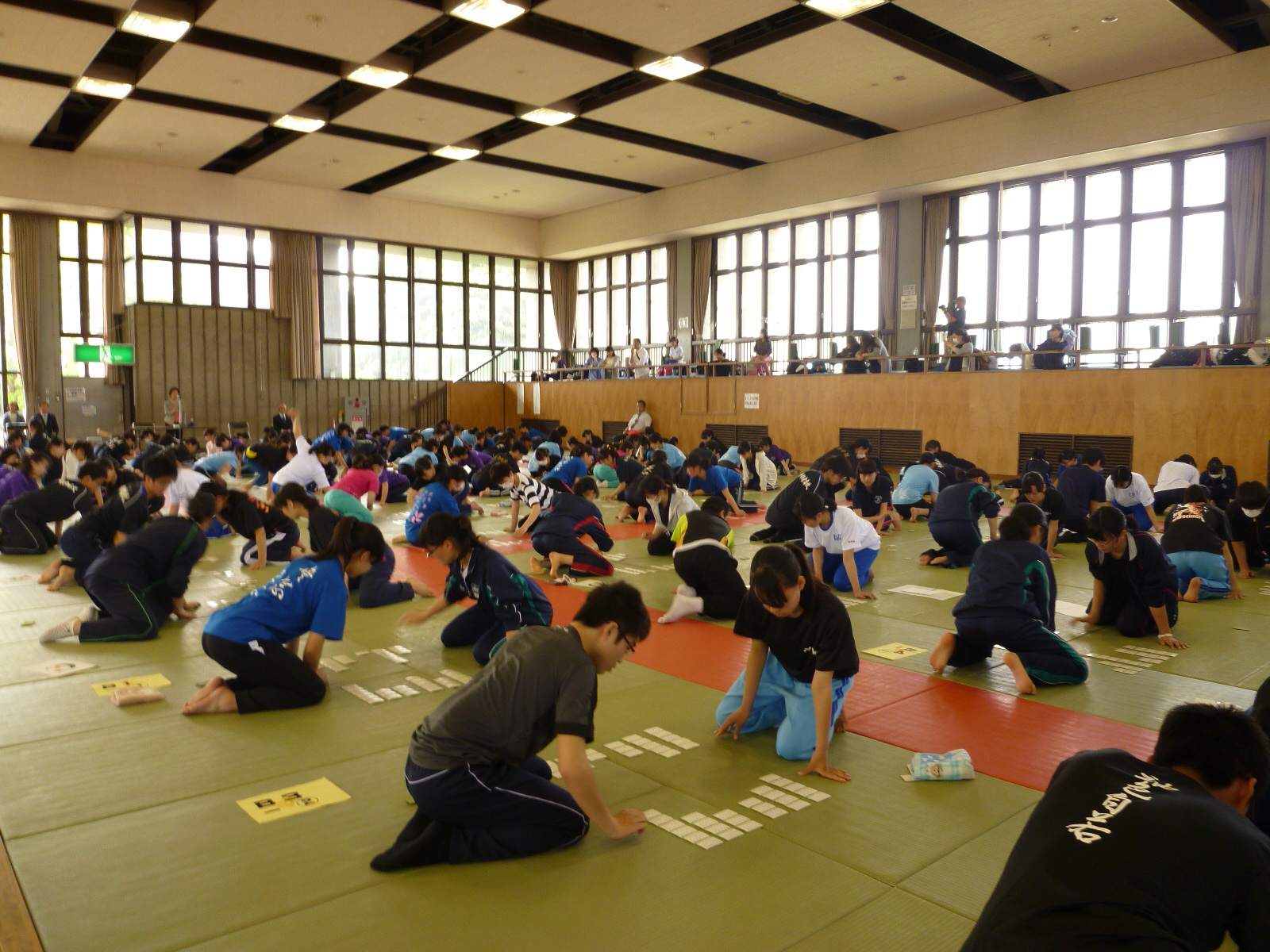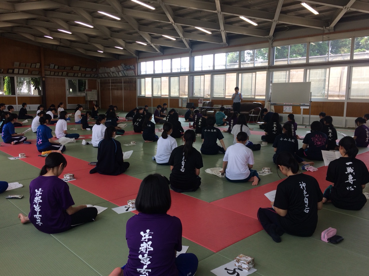 各校かるた部の1年生の部員約70名が参加し、栃木県かるた協会副会長の富岡聖先生のご指導の下、構えの姿勢や、札を覚える手順、勝ちを意識した札の取り方など、実践的な事柄を丁寧に教えていただき、大変有意義な時間を過ごしました。