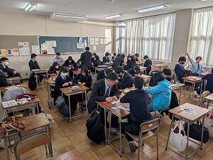 午前中は、広島県出身の髙岡様を講師にお招きして「被爆体験講話」をしていただきました。講話では、原爆が投下された当時の街の様子や被爆した時に出会った人々の話、その他に語り手としての心構えや語り手として現在活動されている様子なども教えてくださいました。生徒たちも終始、講話を真剣に聞いていました。