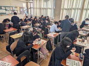 また午後には、関西風の出汁を使ったうどんや、たこせん(エビみりん煎餅にたこ焼きをはさんだもの)を食べ、関西の食文化を体験しました。食べた生徒からは、関西の出汁は薄くて美味しいとの声が多く、中にはお代わりをしたがる生徒もたくさんいて、満足した様子でした。後半は、各自テーマを決めて関西についてタブレットやパンフレットを用いてまとめ作業を行いました。