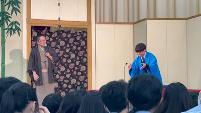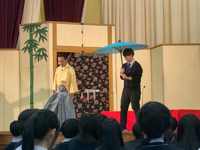 本格的な落語を鑑賞するまえには、「寄席入門」のコーナーで、落語の基本的な知識や扇子と手ぬぐいを使った演じ方などを生徒が実践してみる機会も頂き、大変盛り上がる鑑賞会となりました。