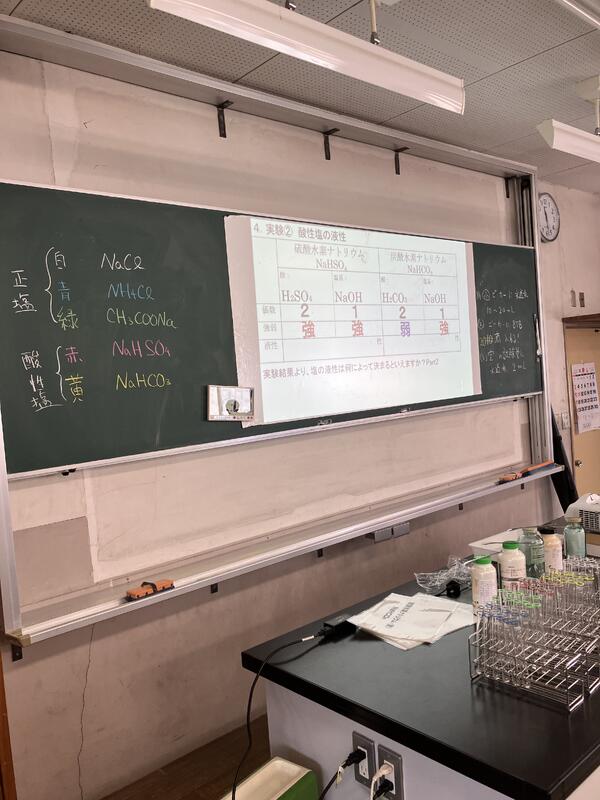 最初の授業では、「中和」の原理について学び。吾妻川の水質改善の事例をもとに、酸性の水がどうして問題になるのか、を考えました。さらに、酸の濃度を実験的に求めるにはどうすればよいのかを考えました。