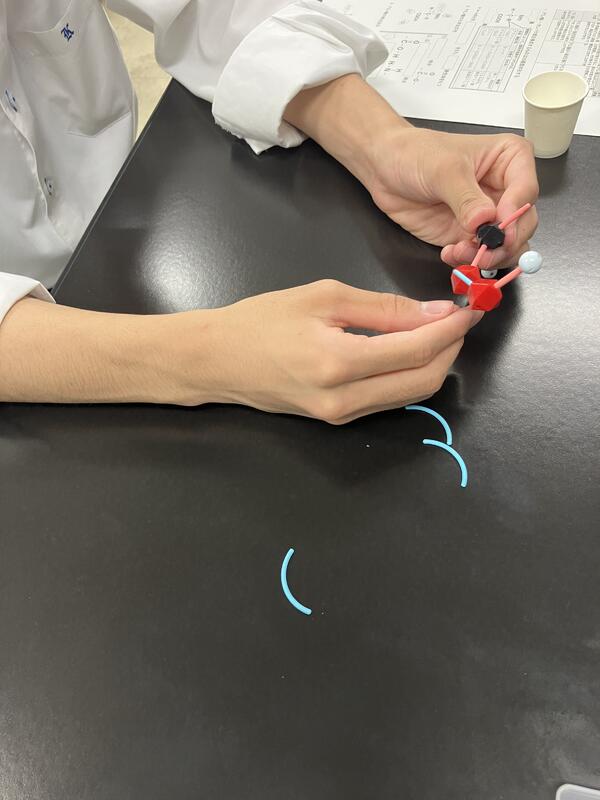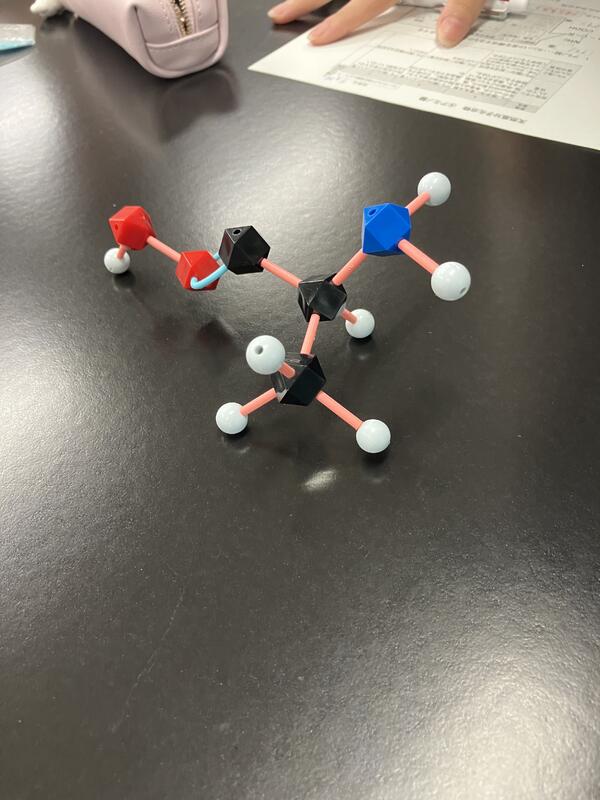 生徒たちは分子模型を作成し、立体構造を再現しながら考察を進めます。ヒントとして提示されたのは双性イオンの存在。模型を見ながら「なるほど、だから強いイオン結合が働くんだ!」と気づく瞬間があり、教室は盛り上がりました。