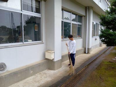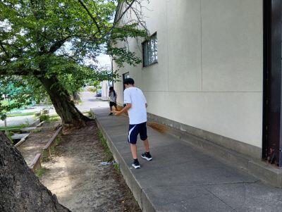 「立つ鳥跡を濁さず」チームを代表して1年生の鈴木(金田北中学校出身)が荷物置き場を掃除してくれました。