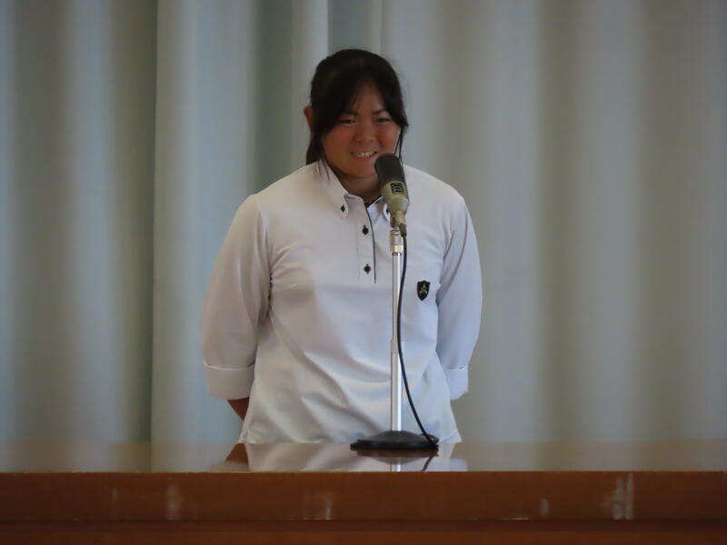 1年 森田 さら さんが、10月18日から山梨県で行われる「関東高等学校選抜新人陸上競技選手権大会」にハンマー投げで出場することとなり、壮行会を行いました。