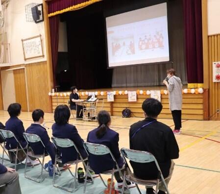 初めに、中学部主事~中学部の生活について説明を受けました。スライドを興味津々に見たり、「うん、うん。」頷いたりしながら聞いていました。