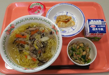 ・ごはん ・はくさいスープ ・とりにくとナッツのいためもの ・はるさめサラダ ・フルーツあんにん ・ぎゅうにゅう