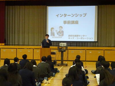 キッズ・コーポレーションより講師の金井 健史 様をお招きし、来月11月に職場体験を控える1年生に向けて、職場での礼儀作法や立ち振る舞いについてご指導いただきました。講話の中では、礼やあいさつの実演も交えながら、実践的に学ぶことができ、生徒にとって大変有意義な時間となりました。