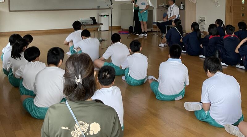 1年生はHello!と元気よく挨拶をした後、自己紹介をしました。自分の名前と好きな物を伝え、Nice to meet you!と言いながら握手をすることができました。それから「Head Shoulders Knees and Toes」を歌いました。途中でレベルアップをして、後半のEyes Ears Mouth Noseの部分をRun Turn Jump Smileに変えてランダムにブライアン先生に歌ってもらい、それに合わせて動く活動をしました。体を大きく使いながら、楽しく英語に触れることができました。授業後、生徒たちはもっとやりたかったと先生との別れを惜しんでいました。