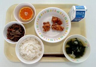今日は鶏肉の唐揚げもさることながら、昆布とごぼうの炒め煮が子どもたちに好評でした。昆布とごぼうの他に、人参、糸こんにゃく、さやいんげん、牛ひき肉が入ります。材料を炒めてからしょうゆとざらめで味付けし煮含めます。すき焼きのような味で、苦手な食材が入っていてもおいしく食べられたようです。