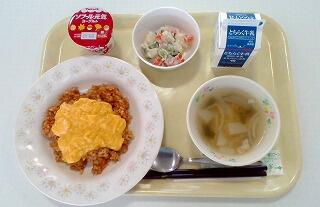 今日は、子どもたちに大人気のオムライスです。ケチャップライスはトマトピューレーとコンソメを一緒に炊き込み、炊き上がったらケチャップで味付けした具材を混ぜています。大量調理でもムラなくおいしそうな色がつきます。
