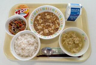 給食の麻婆豆腐は、粗くみじん切りにした筍や干しシイタケがザクザク入っていて食べ応えがあります。豆腐も下茹でしてしっかり火を通してから使っているので煮崩れしていません。具だくさんの麻婆豆腐は子どもたちに人気のメニューです。
