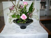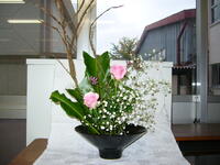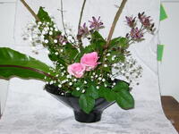 今日はカミソリの木、谷ワタリ、バラ、かすみ草、ホトトギスを使って生けました。