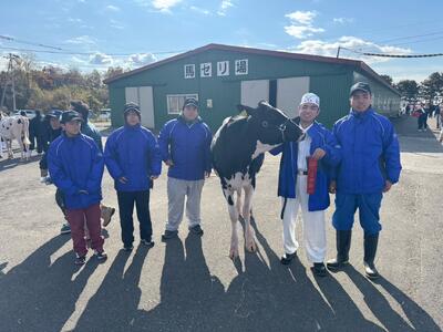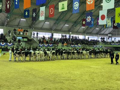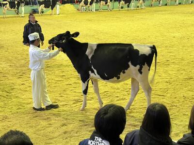 10月25日、全日本ホルスタイン共進会の本番、北海道の舞台で、堂々とリードするリードマンと、それに従って歩く、チーフ 号。結果は37頭中25位でしたが、高校の部の中では7校中3位と、素晴らしい結果で終えることができました。当日は校長先生も応援に駆け付けていただき、生徒の活躍を間近でみていただくことができました。この後生徒達は26日の夕方に会場を出て、フェリー、バスと乗り継いで27日の夕方に学校に到着予定です。