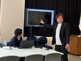 前回ご助言いただいた点について検討した結果、実現性を第一に考え「体育館の床を清掃するロボット」を製作することになりました。開発段階に応じた設計、製作、制御の手法について、(株)アオキシンテックCEO青木圭太様からご指導いただきました。製作について、設計班、製作班、制御プログラム班に分かれて検討を進めました。設計にはCADを使い、機体の動作する回転半径、センサーの配置、固定方法を確認することについてご助言いただきました。