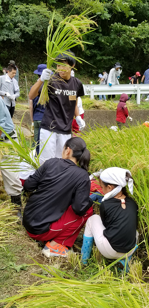 9月14日(土)、保育園児の行事(稲刈り)へのボランティア活動に参加してきました。本校の2年生7名と3年生1名が参加しました。茂木町河又地区の棚田において、幼稚園児の稲刈りの補助をしました。ぬかるんだ水田に足を取られながら、本校生はとても楽しく活動していました。また、河又地区の農業を営まれてい農家の方々との親睦を深めることもできました。