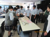 コース料理の説明やテーブルマナーについてなど生徒たちが興味を持ったな内容を実際のお皿やフォーク、ナイフを使って体験をしました。