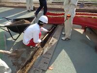 掘削は手掘りで長さ 6. 2 m、深さ 35 cmを行いました。途中、大きな玉石やコンクリートの塊などがあり、苦労しました。その後、プレートによる転圧を行い、高さと方法を合わせながらU字構を敷設しました。初めての作業で戸惑っていましたが、自ら作業を進めることで達成感を味わえました。