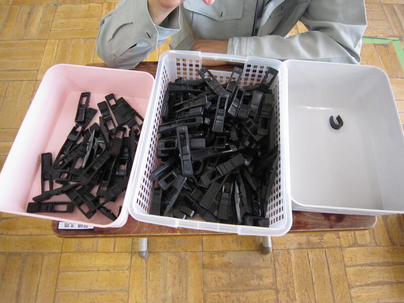 生活分別班が部品を分別し、シール班がピンチにゴムをはめ込み、組立班がハンガーに仕上げるという流れで、各班が協力して一つの製品を完成させています。