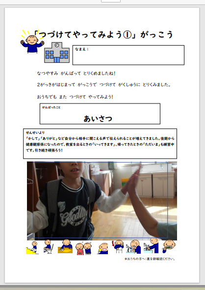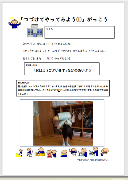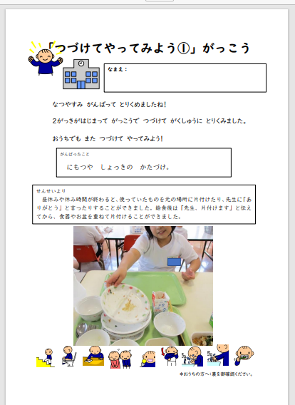 シートの表面は、夏休み後の学校での取り組みの様子をお知らせする形式になっています。